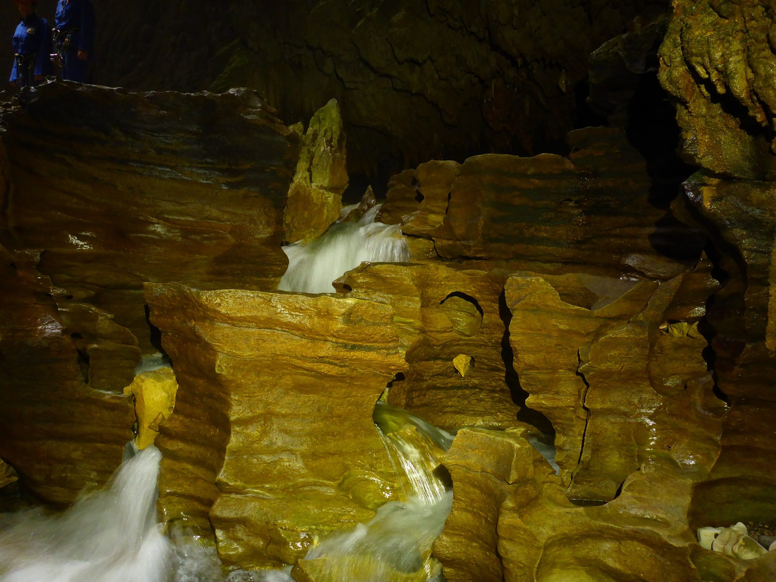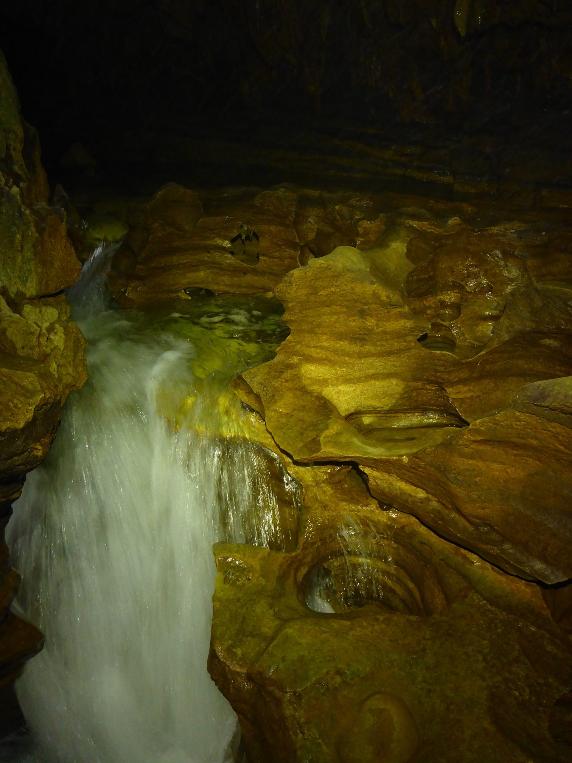 Formations at the entrance to the cave at the bottom.A running underground stream.