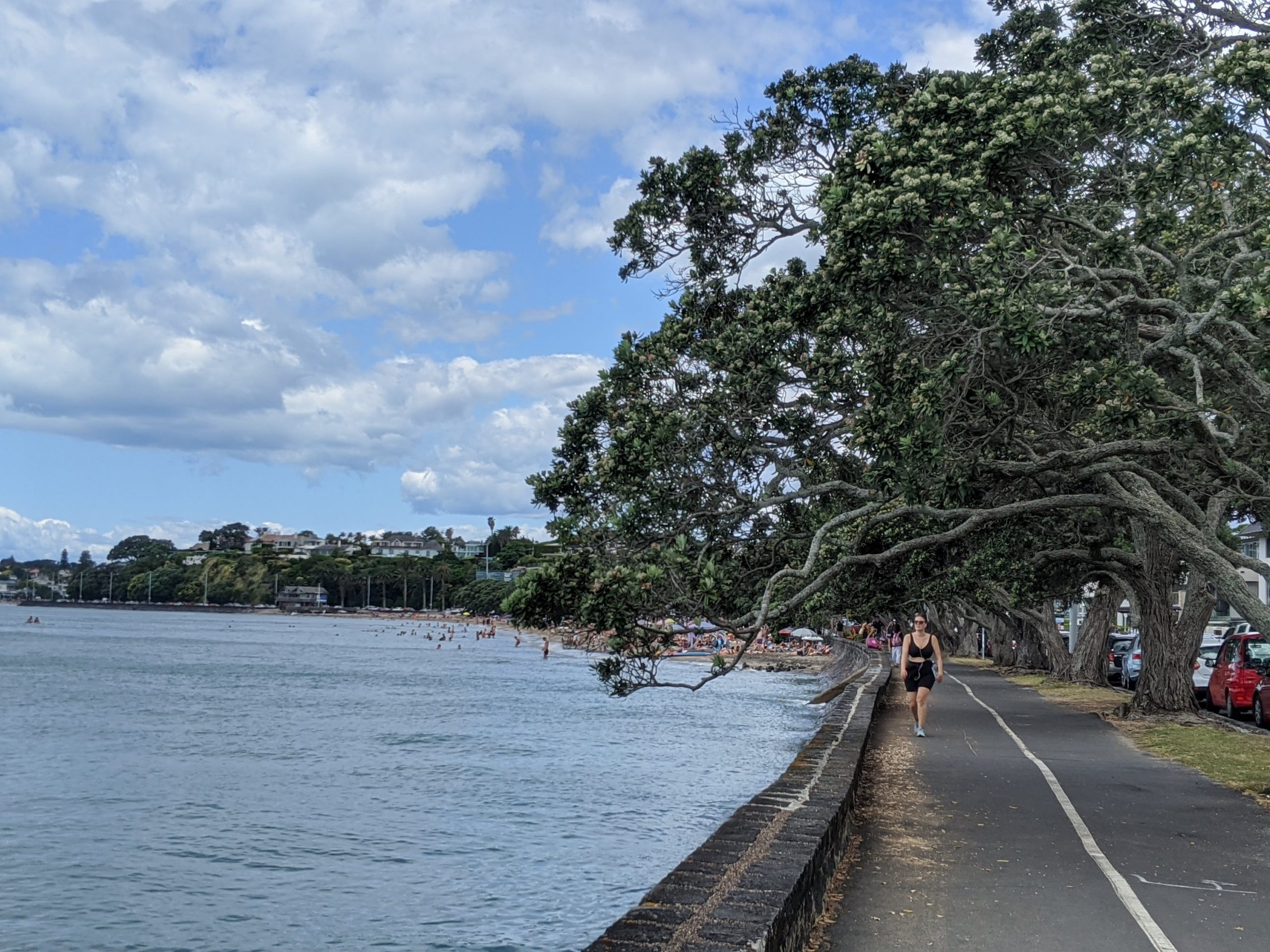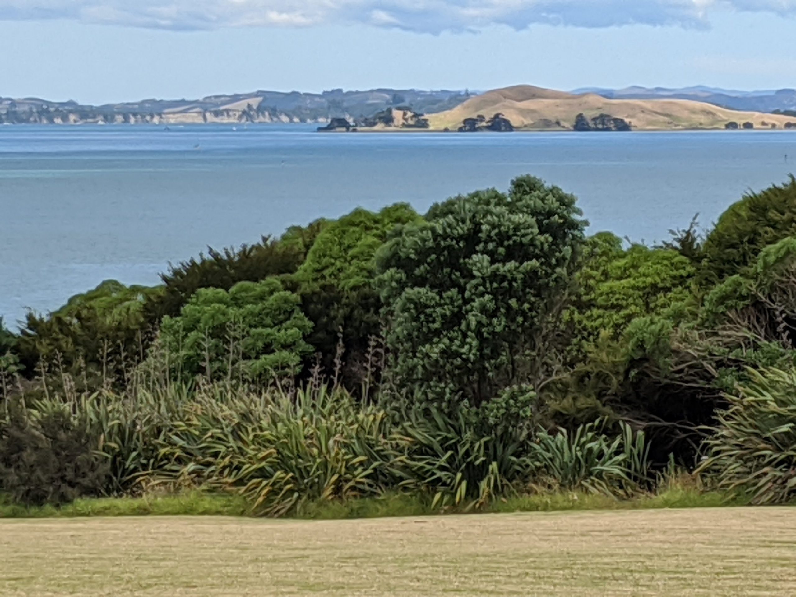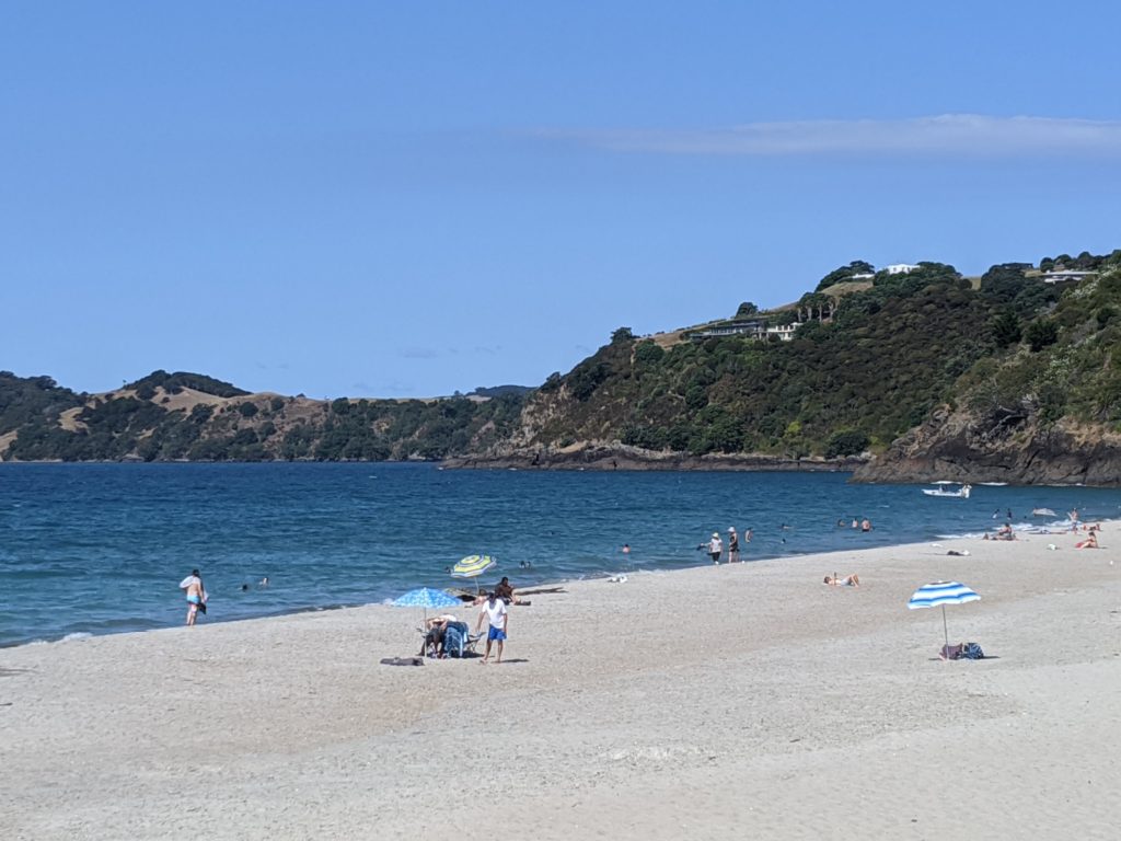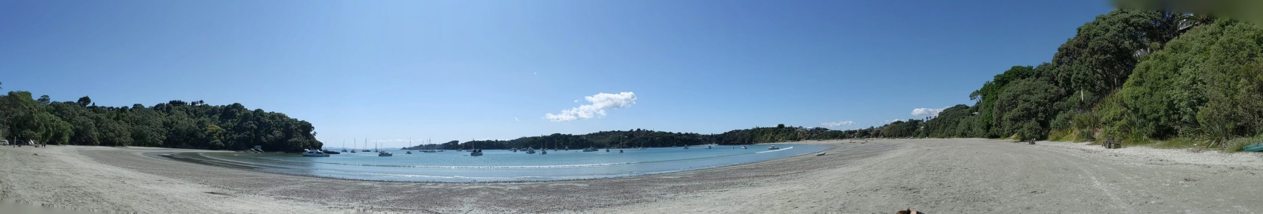 Panoramic view of the beach at Oneroa. We did walk down to the beach and dip toes in the water.