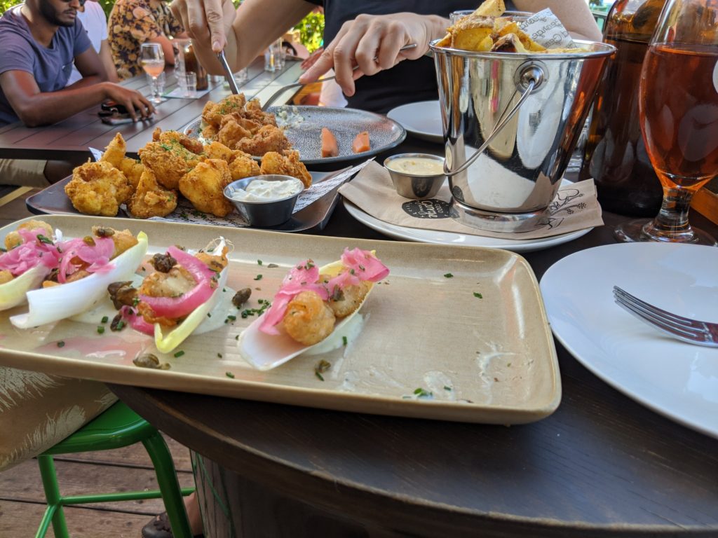 We ate at Public near the beach. It was great. Beetroot salad, grilled cauliflower with carrot mash and fried squid rings. They source locally and have local foods. I also tried alcoholic Ginger beer and a nice ale.