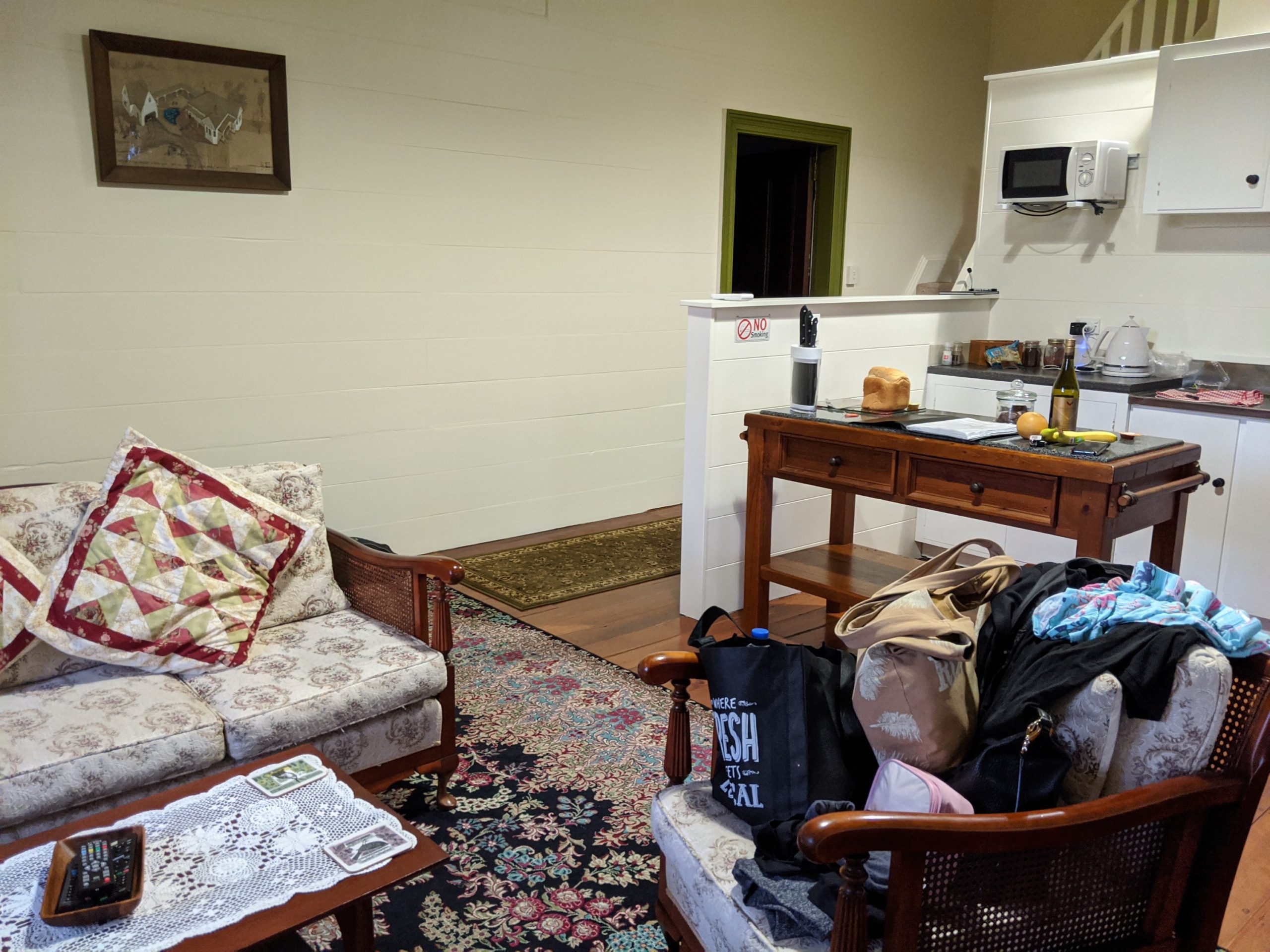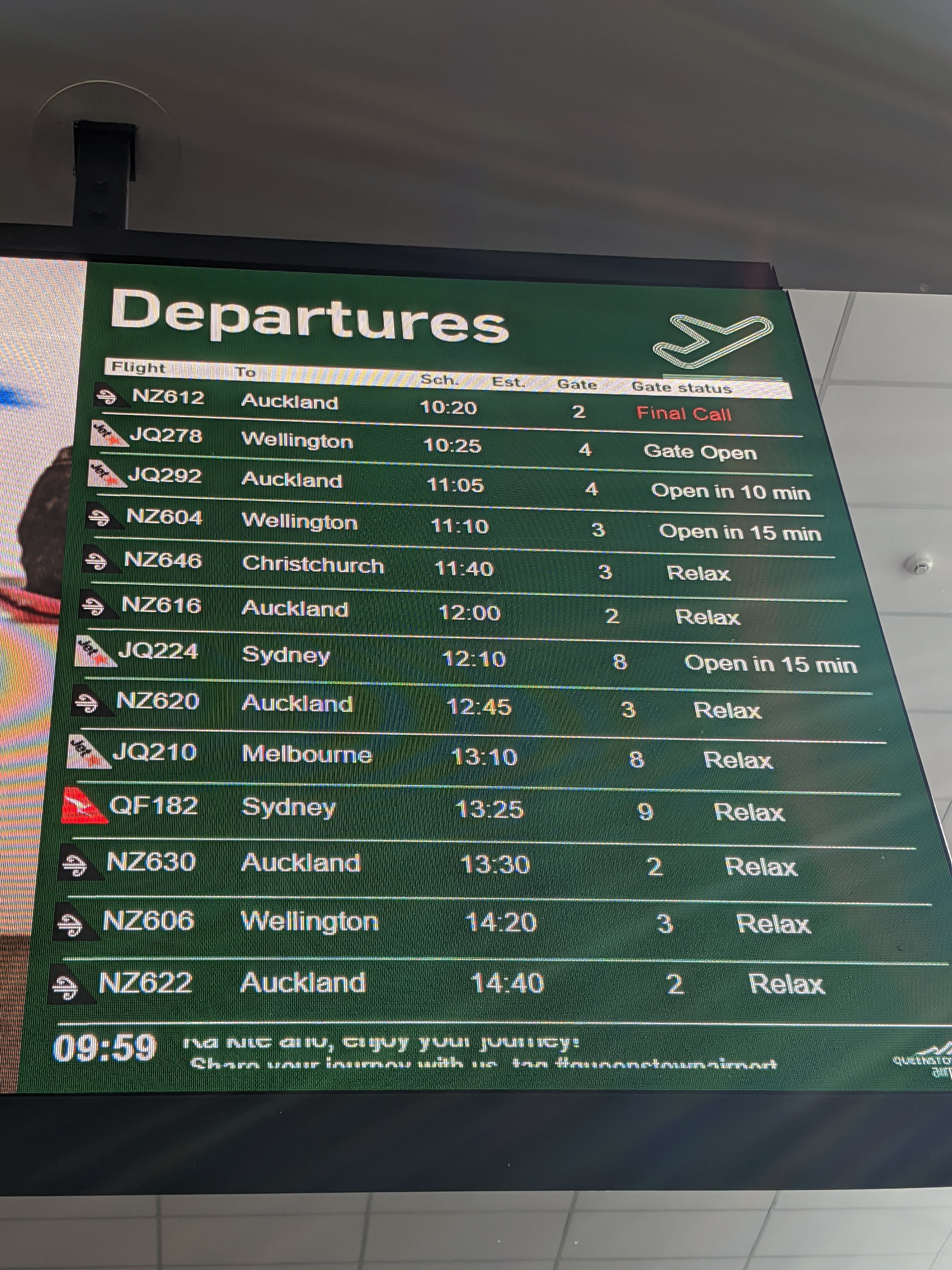 At the airport to go back to Auckland I love how laid back everything is. You easily print boarding tickets and luggage tags and then drop off your bags. Mine was under the 7 kg limit so was able to carry my luggage on. You have to wait if you are too early before going to the gate. This is how they let you know.