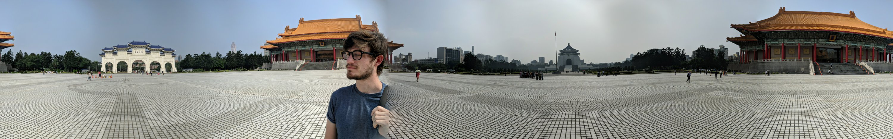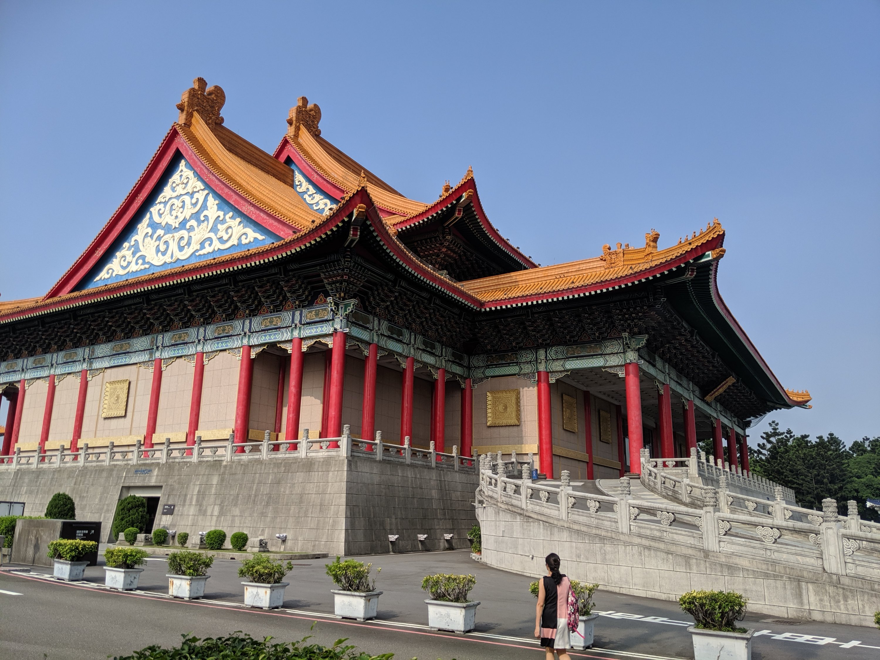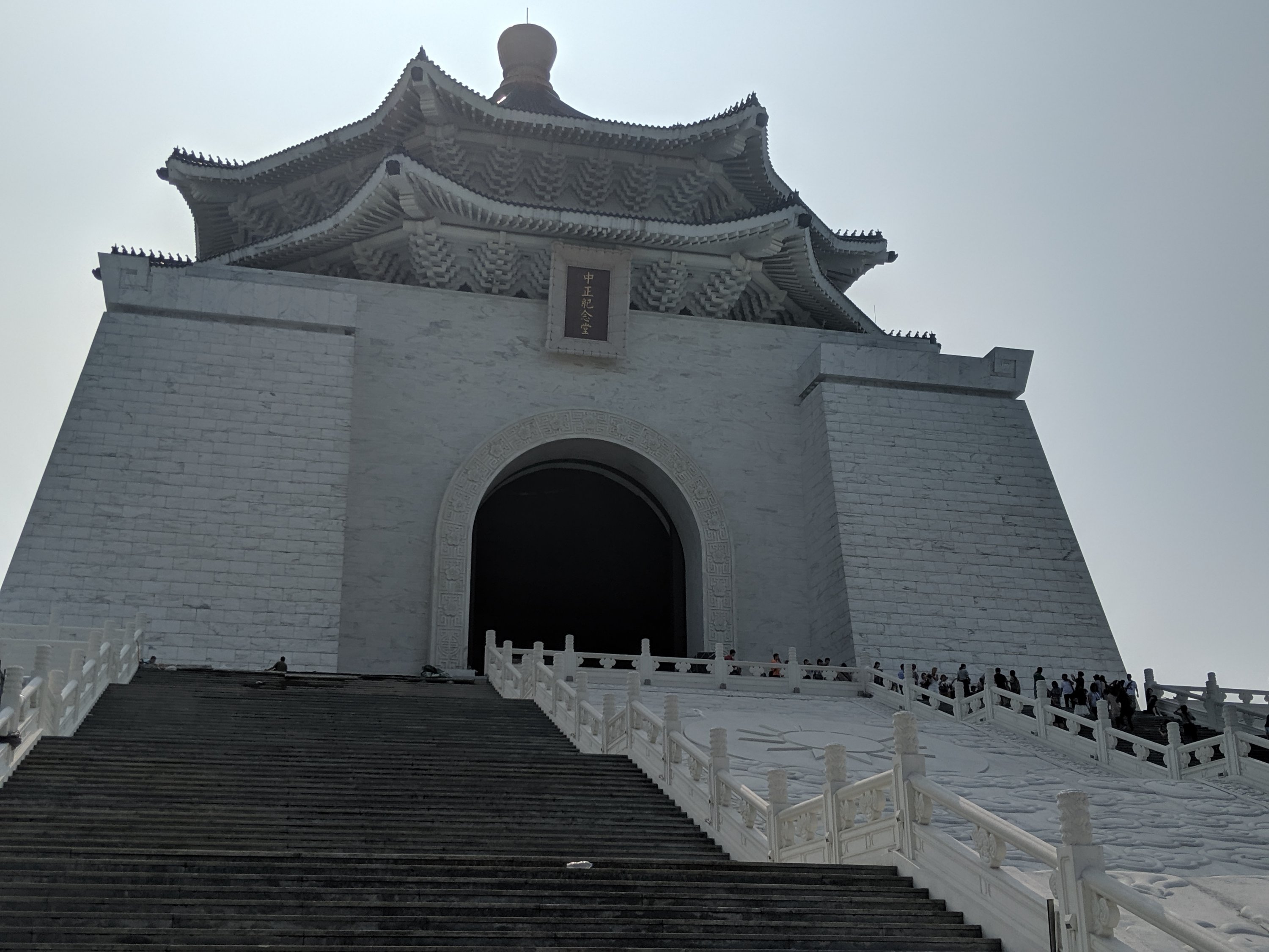 The blue and red accents, are the colours of the Republic of China. The stairs lead up to the main hall where a large bronze statue of Chiang sits.