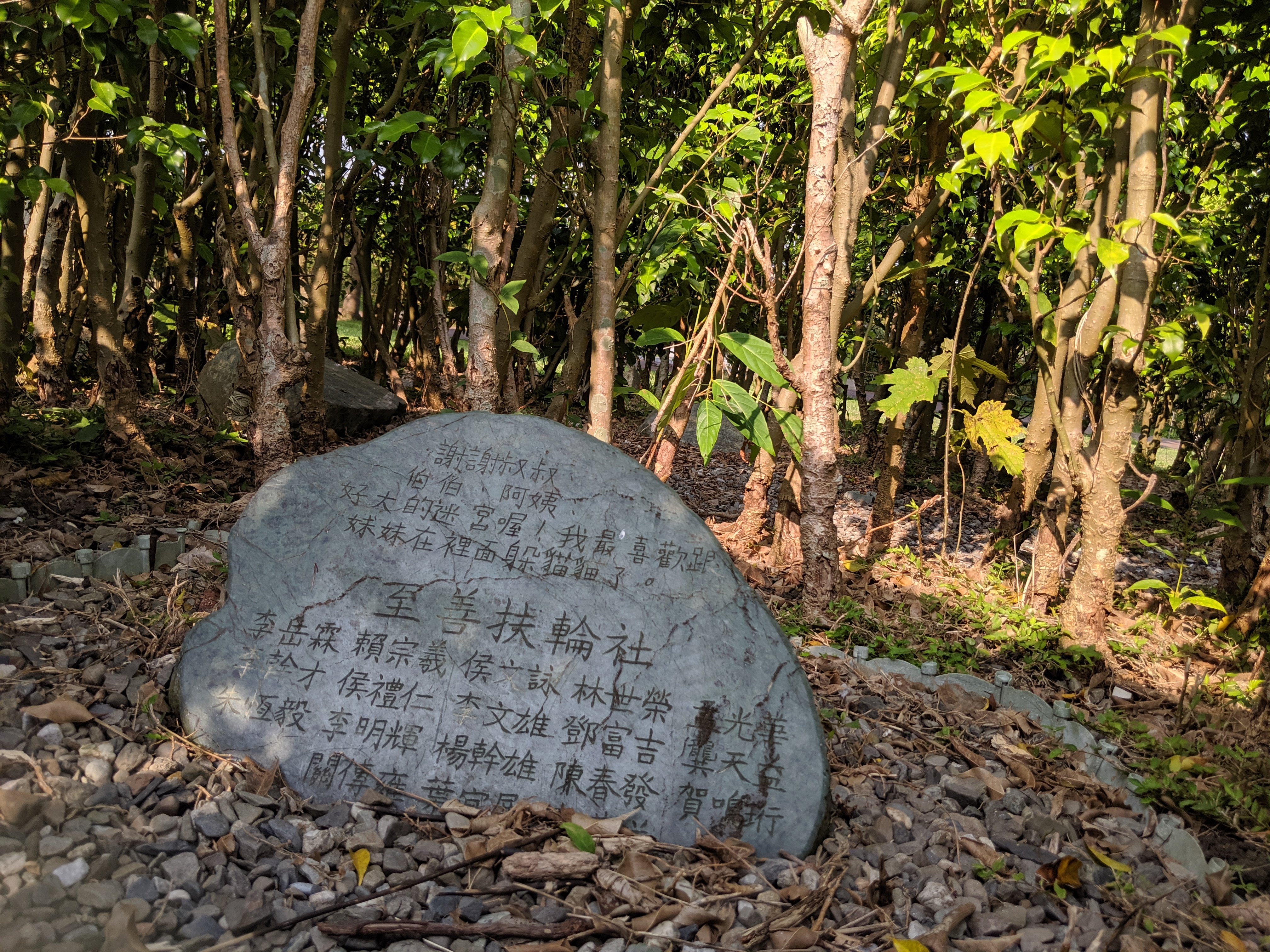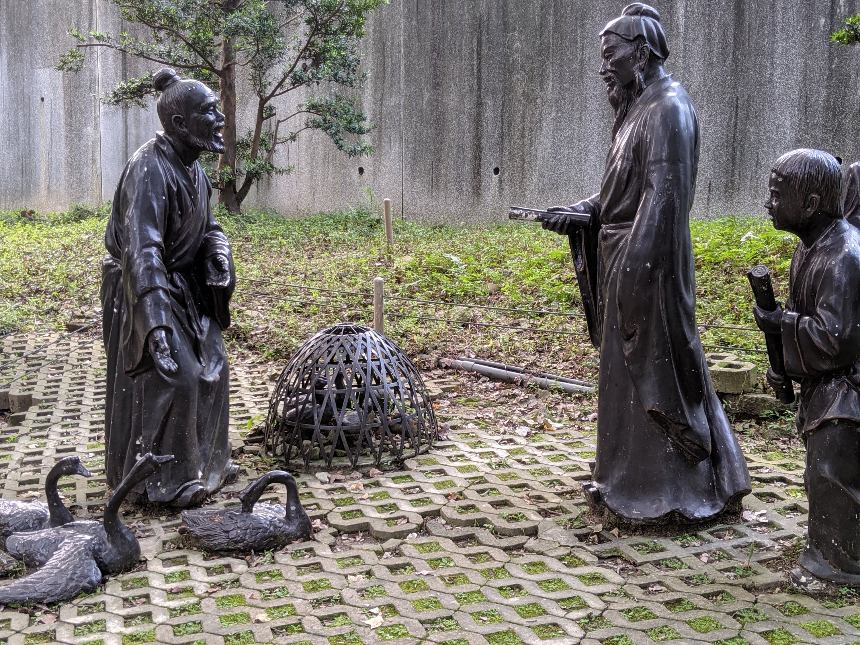 The characters behind Chiang’s statue read “Ethics”, “Democracy”, and “Science”, and the inscriptions on the side read “The purpose of life is to improve the general life of humanity” and “The meaning of life is to create and sustain subsequent lives in the universe”.