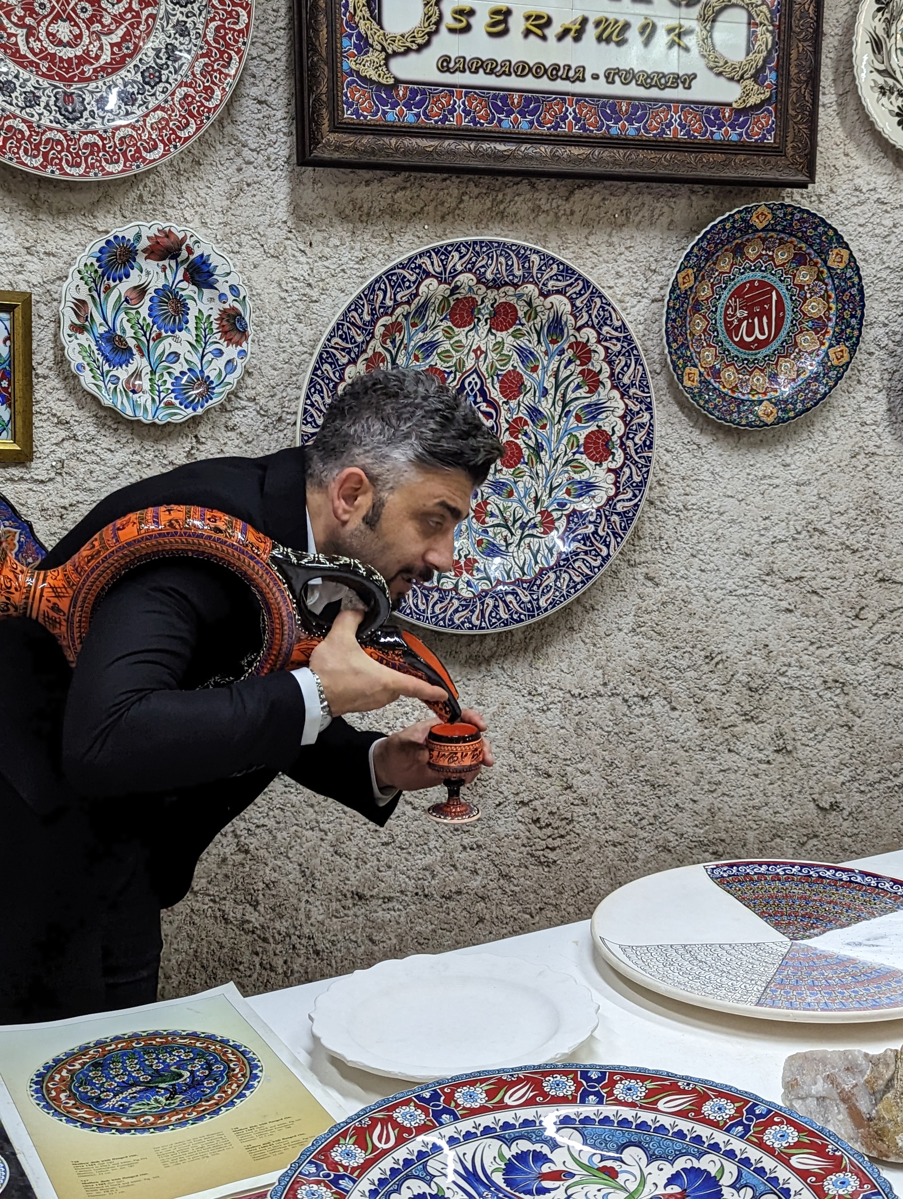 You can see the round drink vessel. It is a work of art itself. The shape allows one to bow as it is poured.