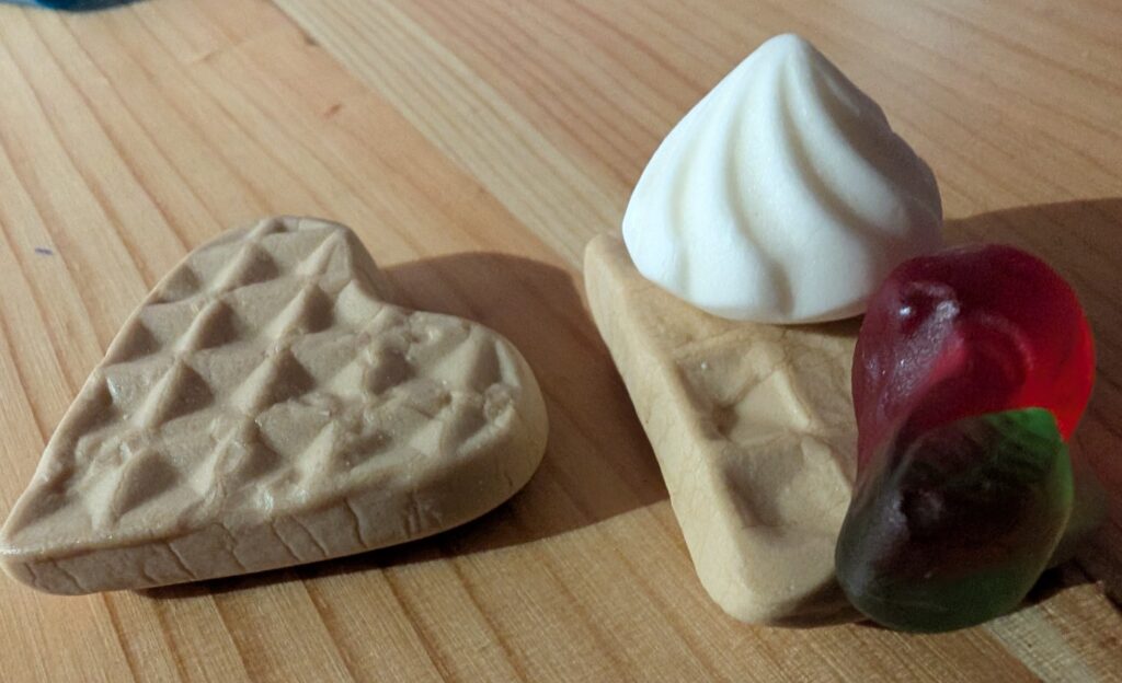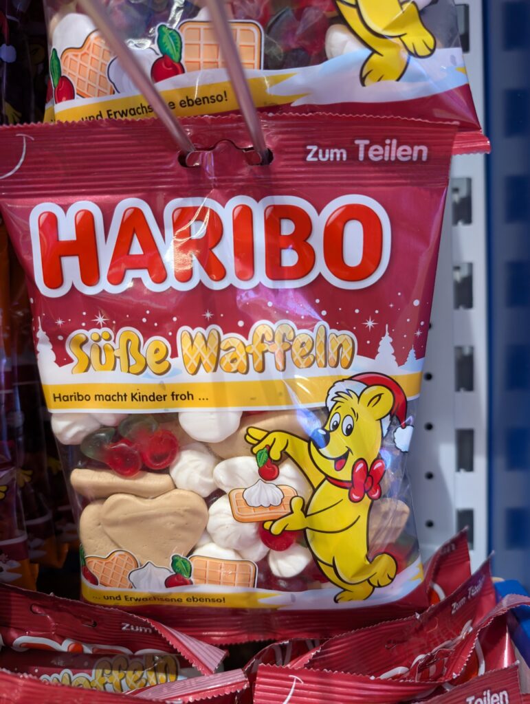 I found a Haribo store. I do love gummy candy and wanted to buy all of it. I had to try the waffle variety. When I opened the bag it did smell like waffles like when you walk into the kitchen for breakfast. It tasted more like vanilla, especially the little cream gummy.