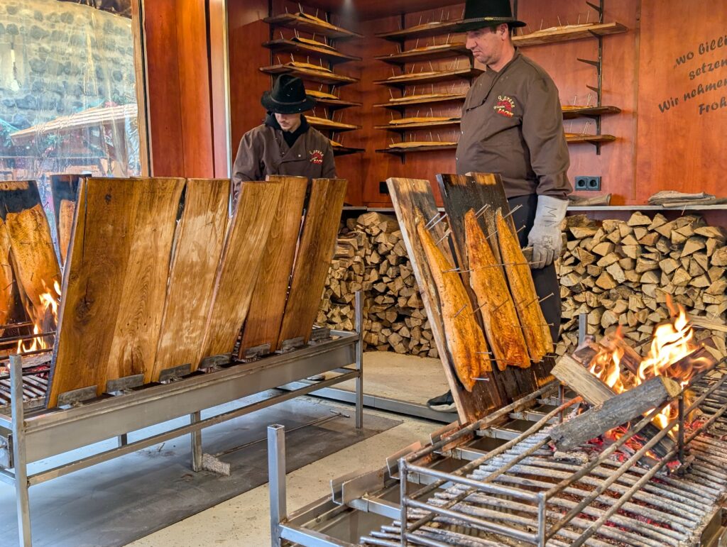 I have been seeing the salmon cooked on big planks on an open fire for several markets. Today was the day and it did not disappoint. I also wanted to go to this market with the gnomes and found a mug with a goat on it. Fitting since I am a Capricorn. I did have to search a few stalls to find one that had that mug.