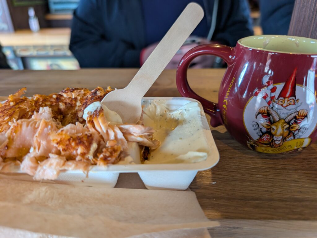 I have been seeing the salmon cooked on big planks on an open fire for several markets. Today was the day and it did not disappoint. I also wanted to go to this market with the gnomes and found a mug with a goat on it. Fitting since I am a Capricorn. I did have to search a few stalls to find one that had that mug.
