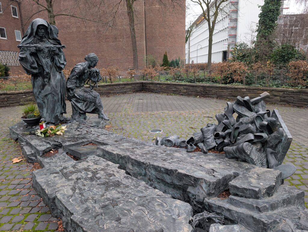 Edith Stein Denkmal was executed in the Holocaust. The scenes are from her life and the shoes represent what was left from her and all those massacred.