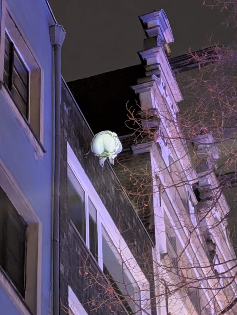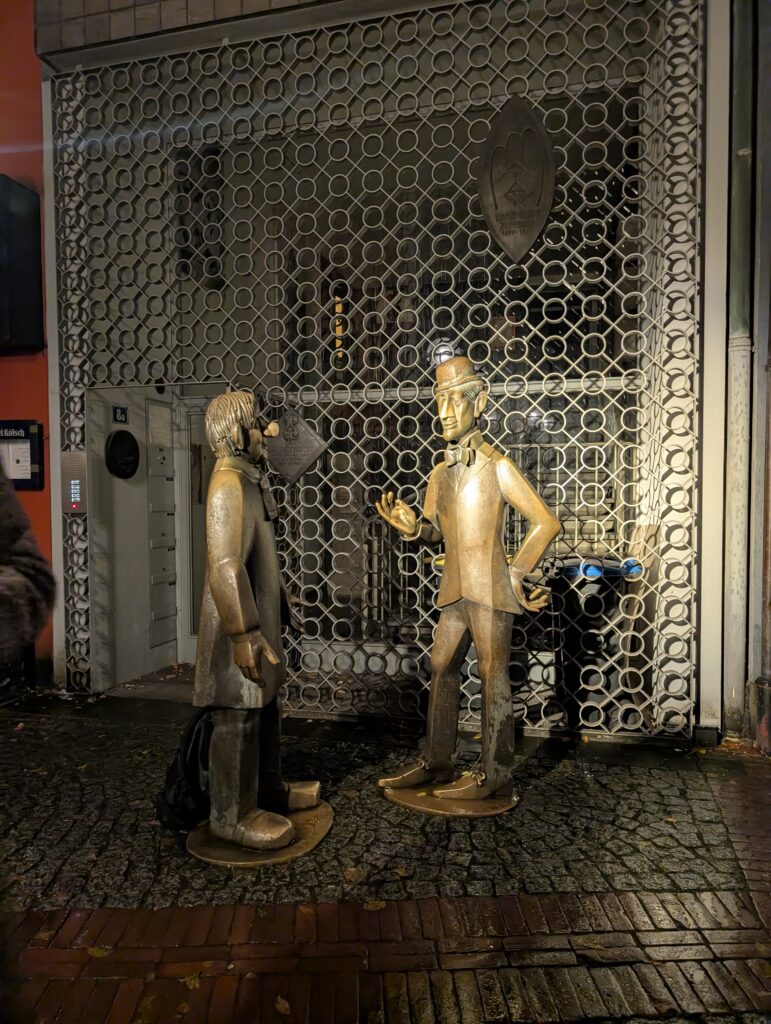 This statue is of a popular old comedian duo (Tünnes and Schäll) here in Germany and it is said that you can have luck, love, or money by stroking the nose or sliding your hand across the chest of the one on the left.