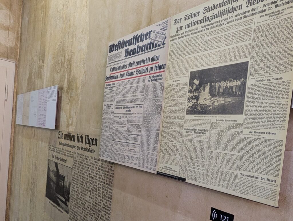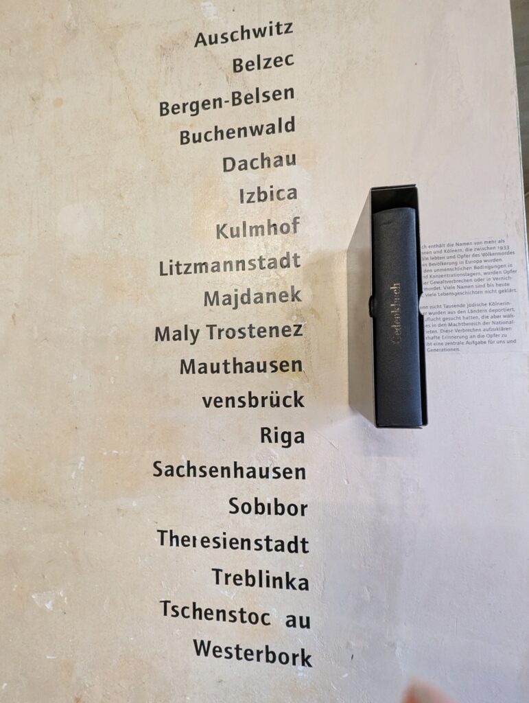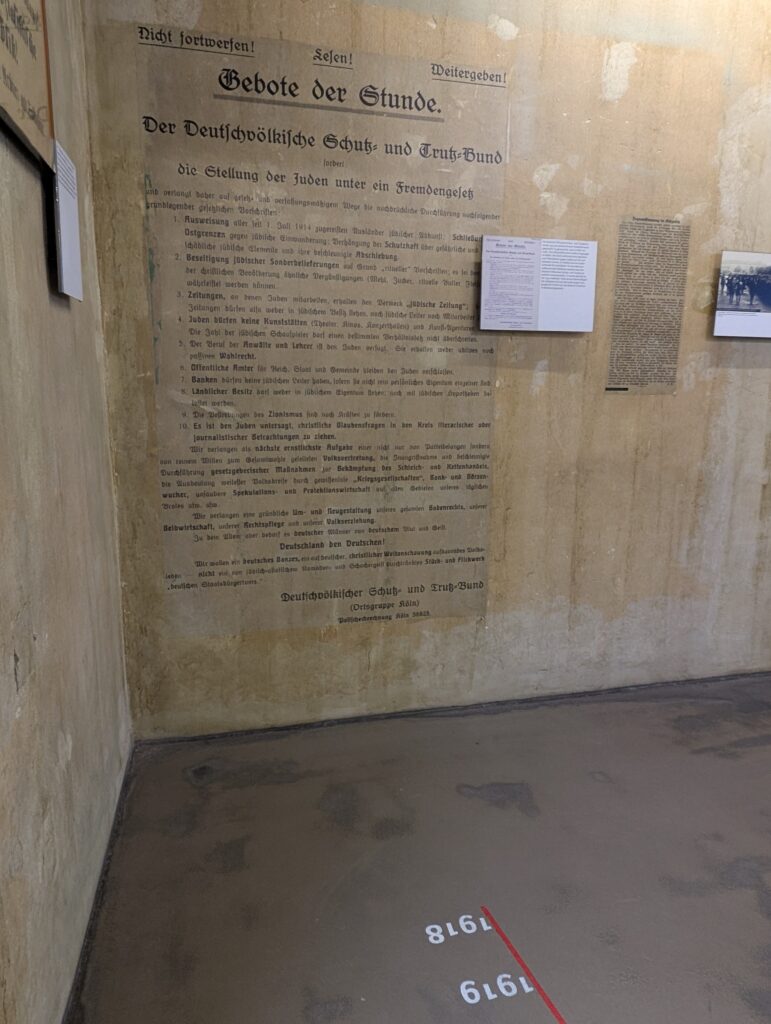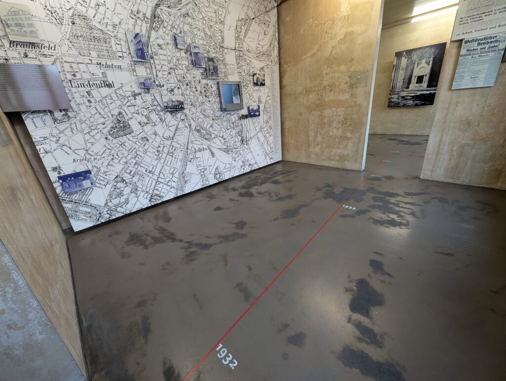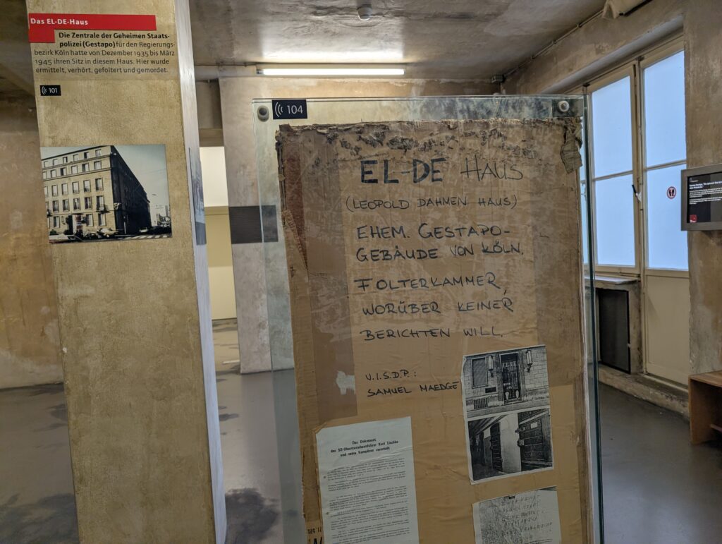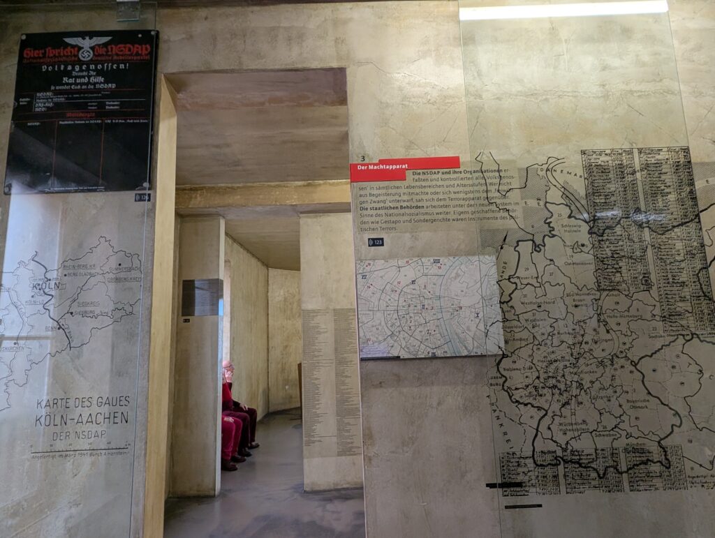 The Gestapo in Cologne. The Gestapo (Geheime Staatspolizei, Secret State Police) established a major regional office in Cologne soon after Hitler took power in 1933. The museum laid out what happened in the 10 years before Hitler took power and all the subtle and not so subtle changes that took place during that time. The timelines on the floor that showed the span in years as you were walking through really brought it all together. As I walked through the area of the changes in societies, attitudes, and how Nazi ideology was slowly permeating throughout, I really felt heavy in my heart and a pit in my stomach with all the parallels currently happening in my country and the world. It was depr swing and terrifying.