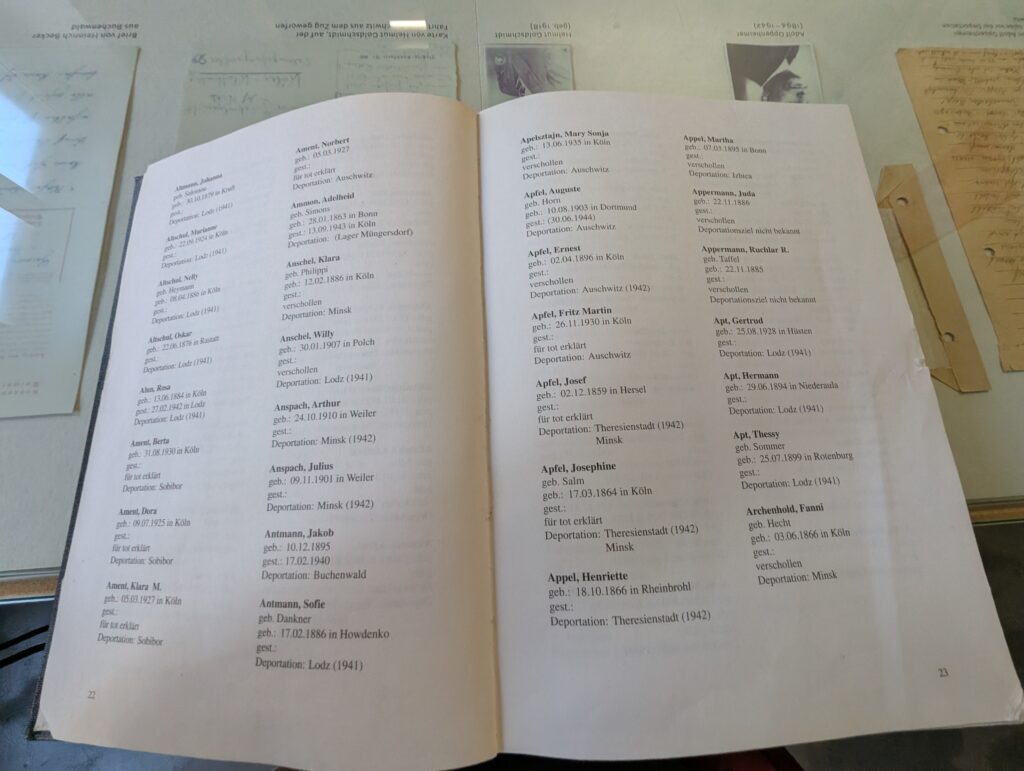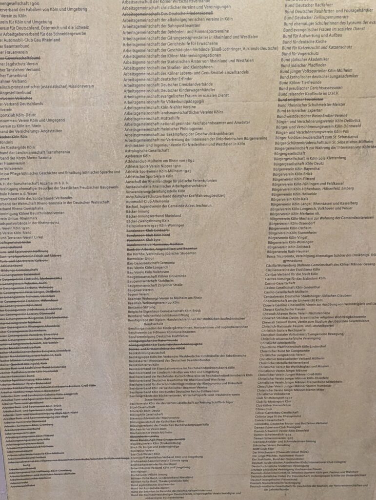 Groups and organizations that were in Cologne are listed on these panels. The ones crossed out were no longer allowed to be in existence. There is a whole room of lists of groups and those with no right to exist.