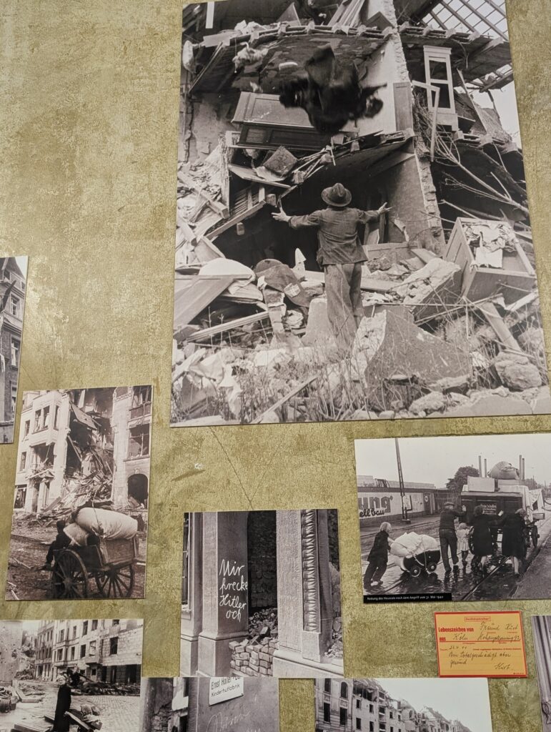 Destruction in Cologne was massive as it was a major industrial and transport center for the Nazis. Many locals perished in the bomb shelters. It is easy to not be moved by their plight and I wanted to skip over these sections. But it was still easy to care and feel horrible for them despite what those in their country have done. They are still people and if I feel they don’t matter, then I am no better.