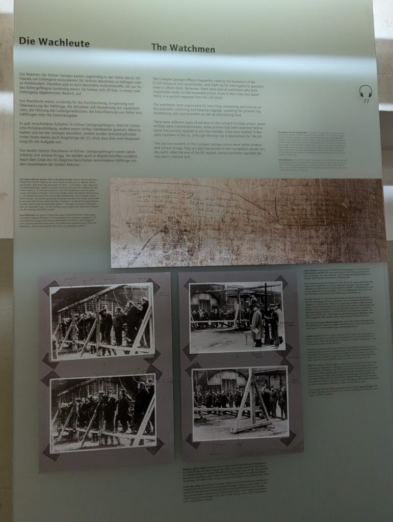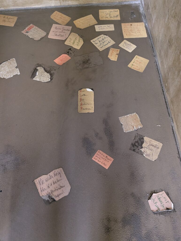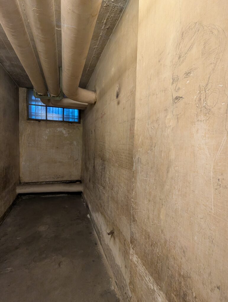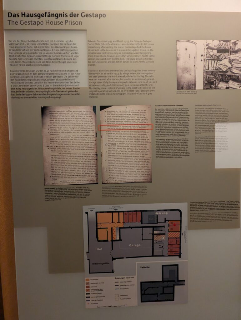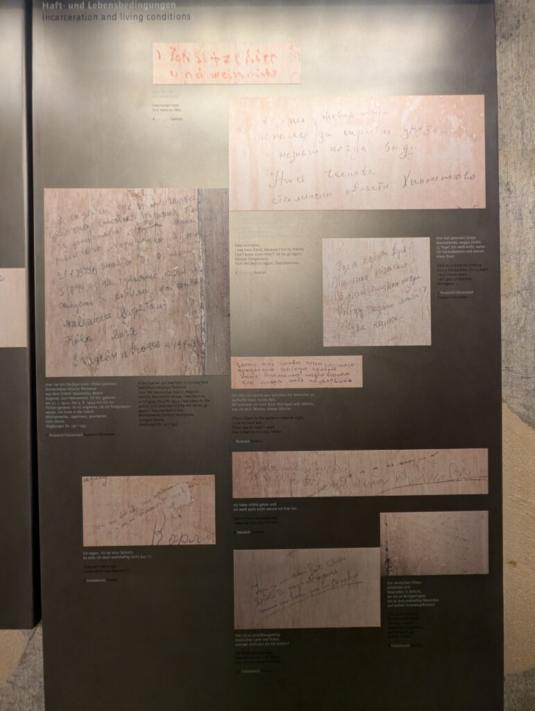Today, the EL-DE-Haus is the NS-Dokumentationszentrum (NS Documentation Center). It is considered one of Germany’s most important museums on Nazi terror. The basement cells, preserved and covered in prisoner graffiti, are one of the most authentic Gestapo prison sites in Europe. What is interesting is that things were filed and stored here for decades before they were found and realized the prison was completely ly intact. Crazy, but once the war was over everything that happened here was conveniently forgotten.