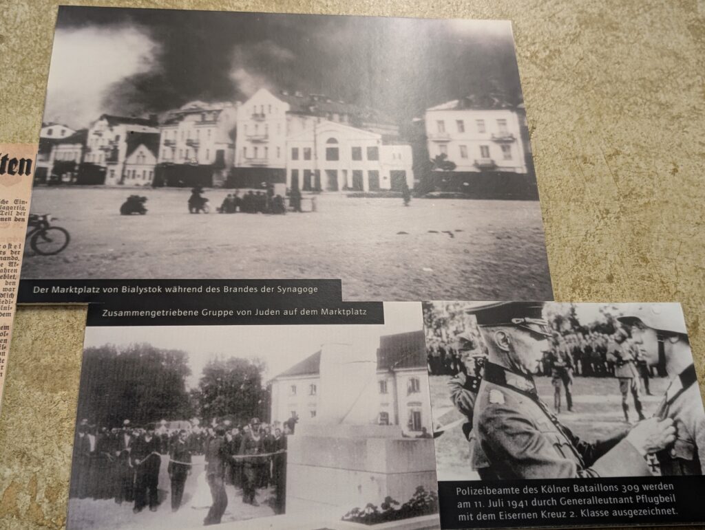 The fire occurring in the background of Bialystok was the result of rounding up local Jews and having them go into the synagogue. Rows of guards surrounded the synagogue to prevent escape as it was set on fire as a mass live crematorium for the 1000 inside.
